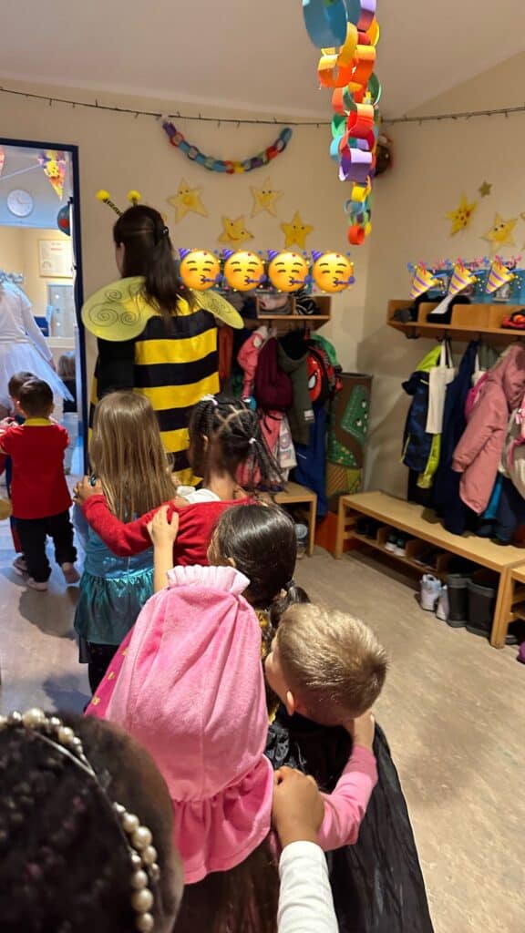 Im Morgenkreis durften alle ihre Kostüme zeigen, begleitet von fröhlicher Musik, die uns direkt in Feierlaune versetzte. Danach trafen sich die Gruppen zum gemeinsamen Frühstück. Dank der vielen Beiträge der Familien verwandelten sich die Tische in ein kleines Schlaraffenland mit süßen und herzhaften Snacks. Überall sah man glückliche Kinderaugen.